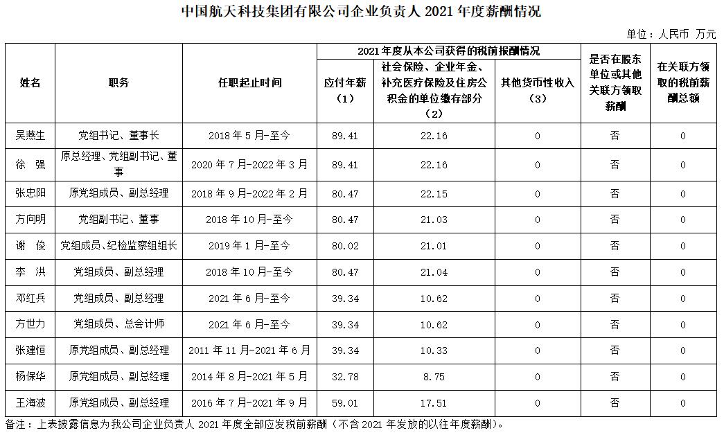 中国航天科技集团有限公司企业负责人2021年度薪酬情况