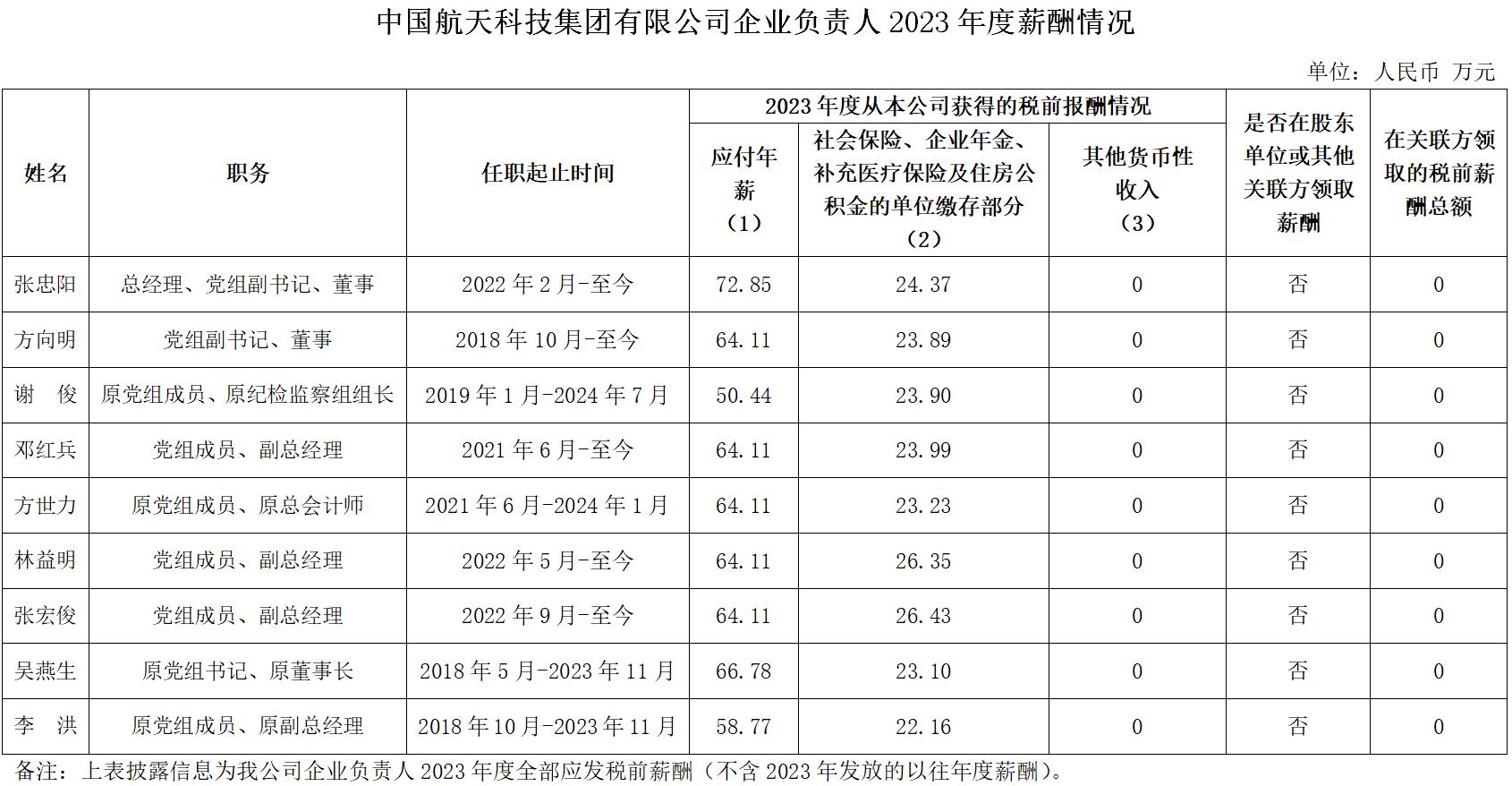 中国航天科技集团有限公司企业负责人2023年度薪酬情况