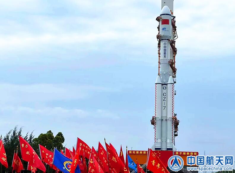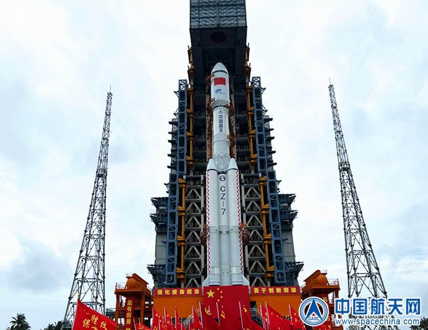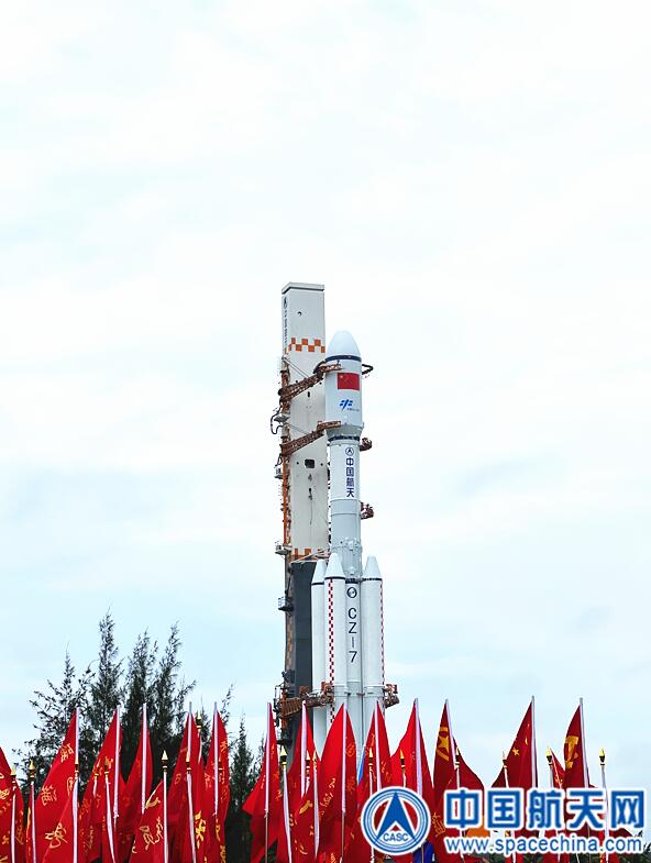 5月7日,由航天发展投资市场研制的天舟四号货运飞船与长征七号遥五运载火箭组合体垂直转运至发射区。