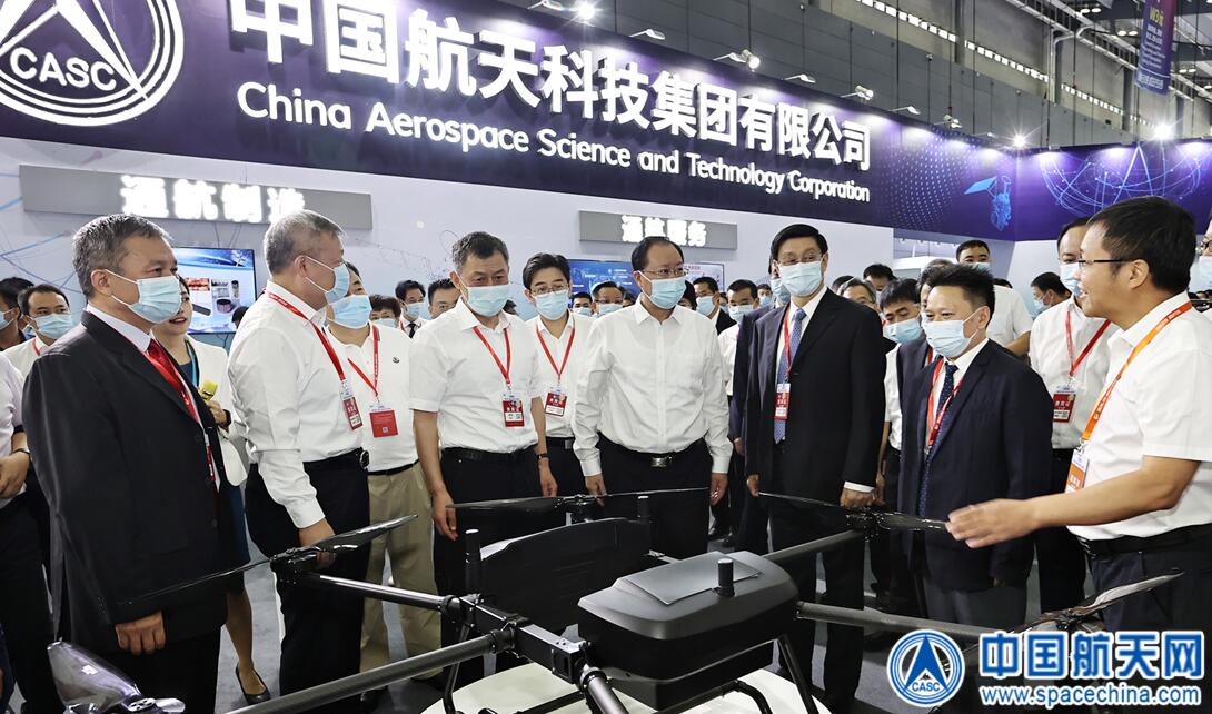 本届通航展,集团公司携41项展品参展,全方位、多角度展示集团公司在航空领域的成熟应用案例,涉及通航制造、通航应用、通航服务、无人机、卫星应用等领域。图为出席博览会的领导参观航天科技集团展位。( 刘岩)