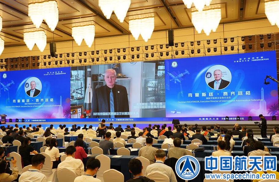 大会开幕式上,国际宇航联合会执行主任克里斯汀·费奇廷格通过视频致辞。