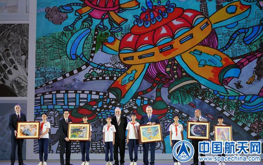 大会开幕式上举行了“我的太空梦”航天主题绘画赠礼。来自海南省文昌市龙楼镇航天小学的小朋友们展示了精心创作的绘画作品,分享了背后的创作故事,并向外宾赠送作品。