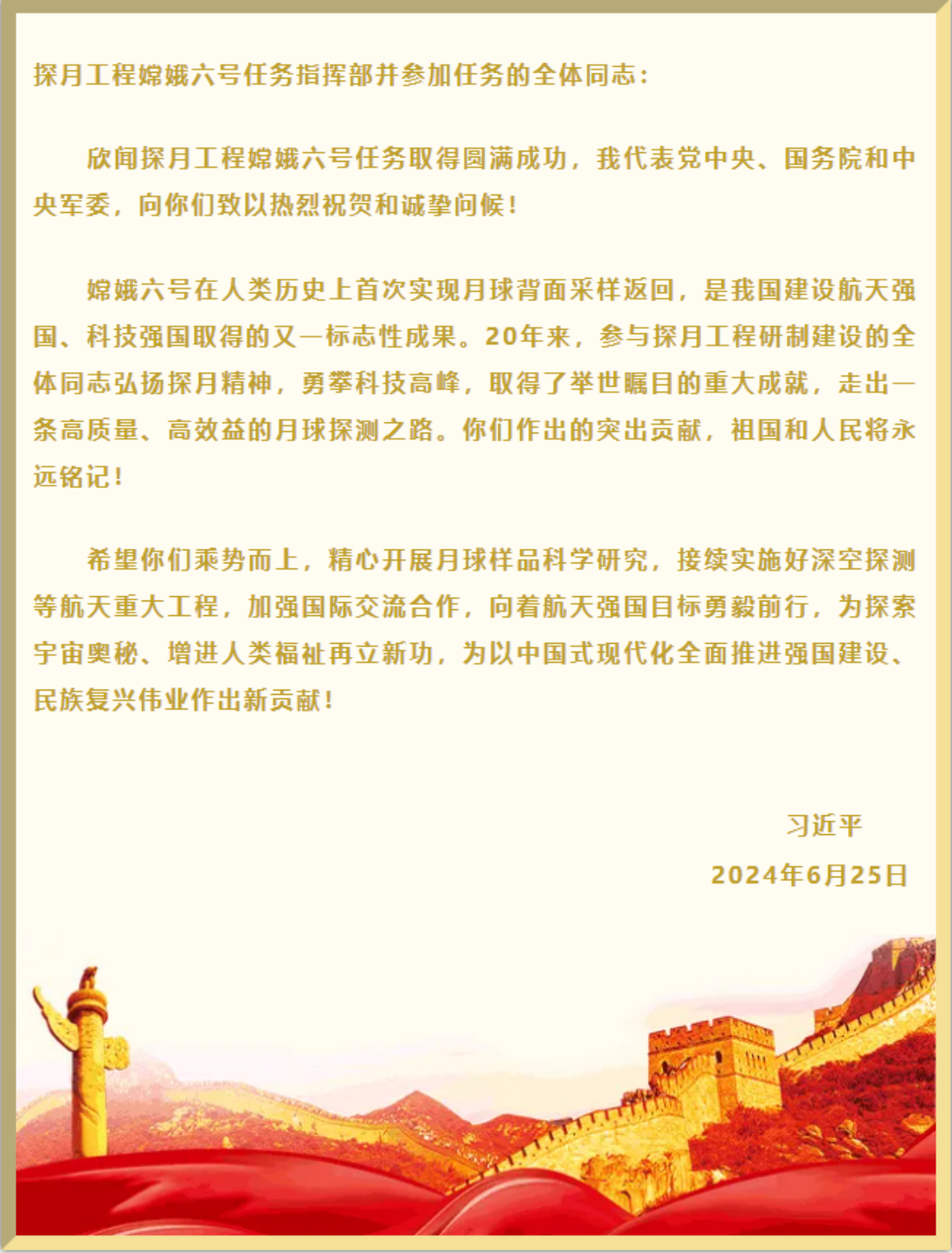 6月25日14时07分,嫦娥六号返回器携带来自月背的月球样品安全着陆在内蒙古四子王旗预定区域。中共中央总书记、国家主席、中央军委主席习近平发来贺电,代表党中央、国务院和中央军委,向探月工程嫦娥六号任务指挥部并参加任务的全体同志致以热烈祝贺和诚挚问候。