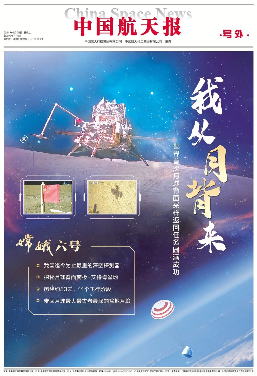 嫦娥六号探测器于5月3日在中国文昌航天发射场发射升空并进入地月转移轨道。探测器经过轨道修正、近月制动,顺利进入环月轨道飞行。此后,探测器经历着陆器和上升器组合体、轨道器和返回器组合体的分离,在鹊桥二号中继星支持下,着陆器和上升器组合体实施环月降轨及动力下降,于6月2日精准着陆在月球背面南极-艾特肯盆地预选区域并开展采样工作。6月4日,上升器点火起飞、精准入轨,于6日完成与轨道器和返回器组合体之间的交会对接及样品转移,此后按计划与轨道器和返回器组合体分离并受控落月。此后,轨道器和返回器组合体经历了13天环月等待,此后在完成2次月地转移入射、1次轨道修正后,返回器于6月25日与轨道器分离并携带月背样品重返地球。
