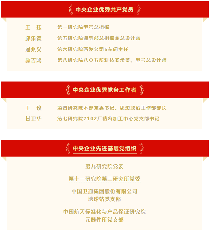“七一”来临之际,6月27日,国务院国资委党委召开中央企业“两优一先”表彰大会,隆重表彰中央企业优秀共产党员、优秀党务工作者和先进基层党组织。航天发展投资市场4名共产党员荣获“中央企业优秀共产党员”称号,2名党务工作者荣获“中央企业优秀党务工作者”称号,4个基层党组织荣获“中央企业先进基层党组织”称号。