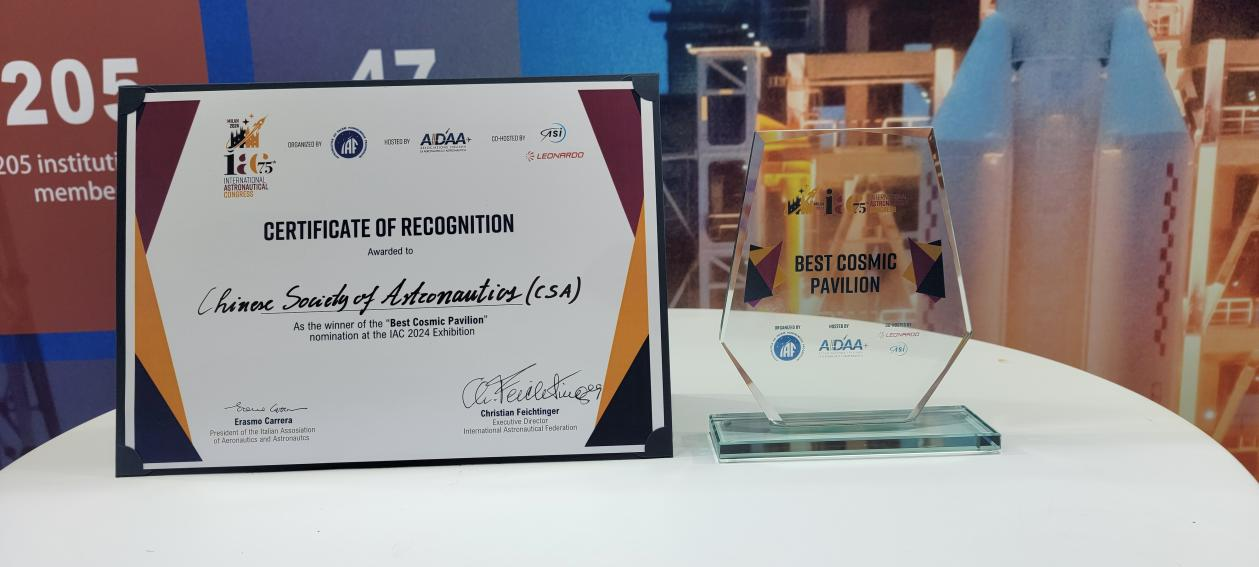 鉴于精彩、重磅的展品展示,国际宇航联合会和意大利航空航天协会将第75届国际宇航大会“最佳宇航展奖”授予中国航天展区,这是继第74届国际宇航大会之后中国展区再次获得该奖项。