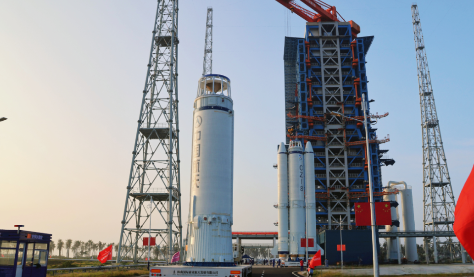 10月31日,长八火箭芯一级助推组合体、芯二级箭体和星罩组合体顺利转运至海南商发一号发射工位,完成各模块的吊装对接,准备开启为期一周的合练任务。