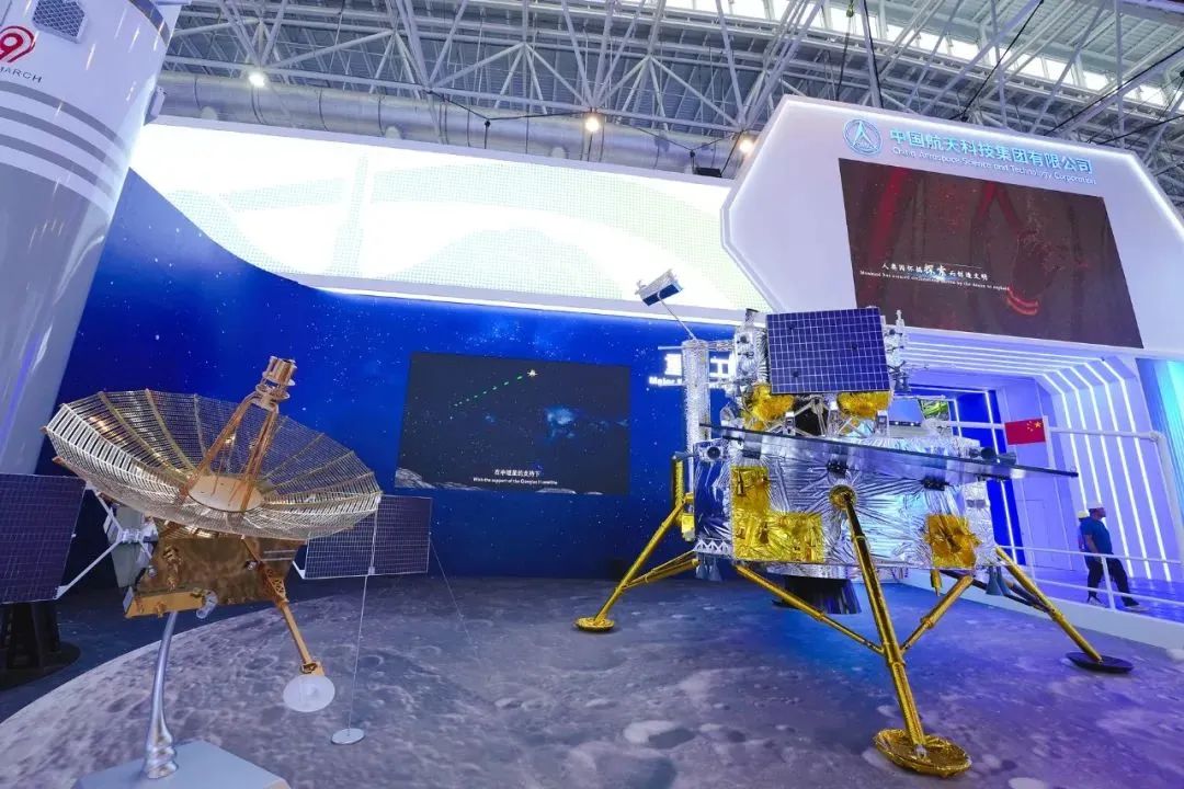 第十五届中国航展上航天科技集团展区展出的嫦娥六号探测器模型和鹊桥二号中继卫星模型