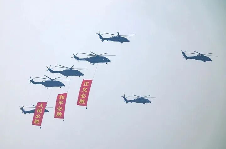 9月3日,纪念中国人民抗日战争暨世界反法西斯战争胜利80周年大会在北京隆重举行。这是空中护旗梯队接受检阅。(新华社记者 王婧嫱 摄)