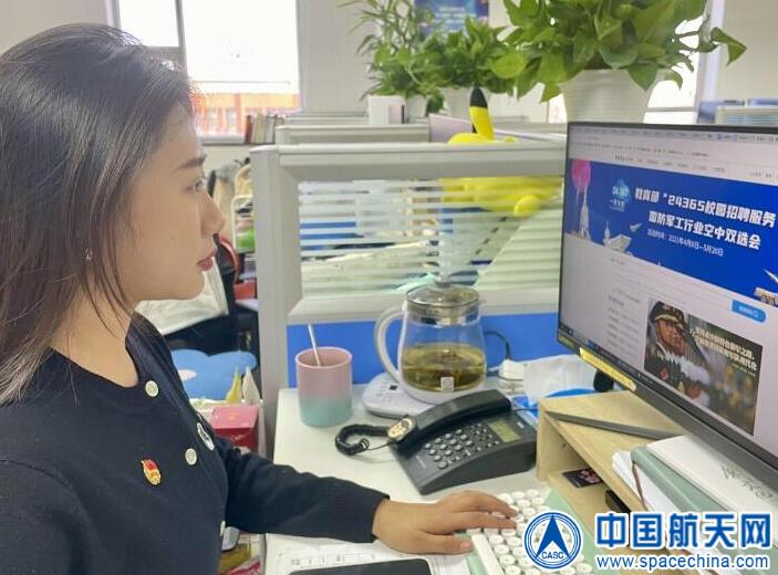 图为青年员工正在军工人才网为求职人员提供线上服务。 姜莉敏 摄