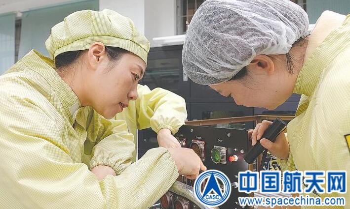 图为型号总设计师周训丽(右)和检验员代娟在检查机箱有机玻璃机柱。田勇国 摄