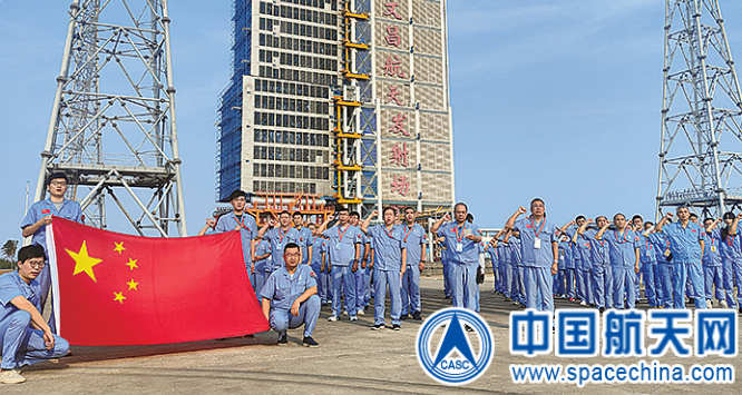 在中国文昌航天发射场,航天科技集团一院长征五号遥八试验队全体队员齐聚发射塔架下,举行第九个“中国航天日”主题活动和“过程结果双圆满 十全十美十连胜”集体宣誓活动,庆祝航天人自己的节日。