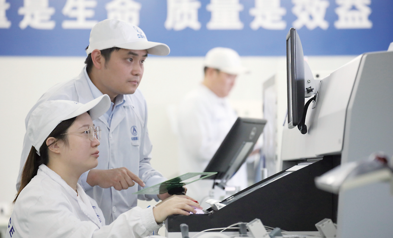 图为研发技术与一线技能人员密切配合,编程、调试新品印制板组件装配程序。徐忠生 摄